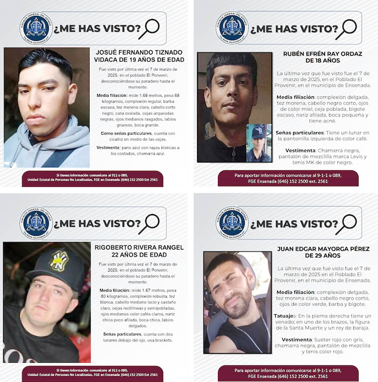 Cualquier información relacionada con esta búsqueda, favor de reportarla al número telefónico de emergencias 911, o a la denuncia anónima 089, o al número (646) 152-25-00, extensión 2560 de la Fiscalía General del Estado, o al correo electrónico xochitlan.vera@fgebc.gob.mx.