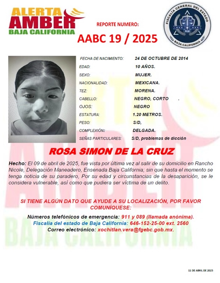 La Fiscalía General del Estado de Baja California informa que ha activado la Alerta Amber para localizar a Rosa Simón de la Cruz, de 10 años de edad.