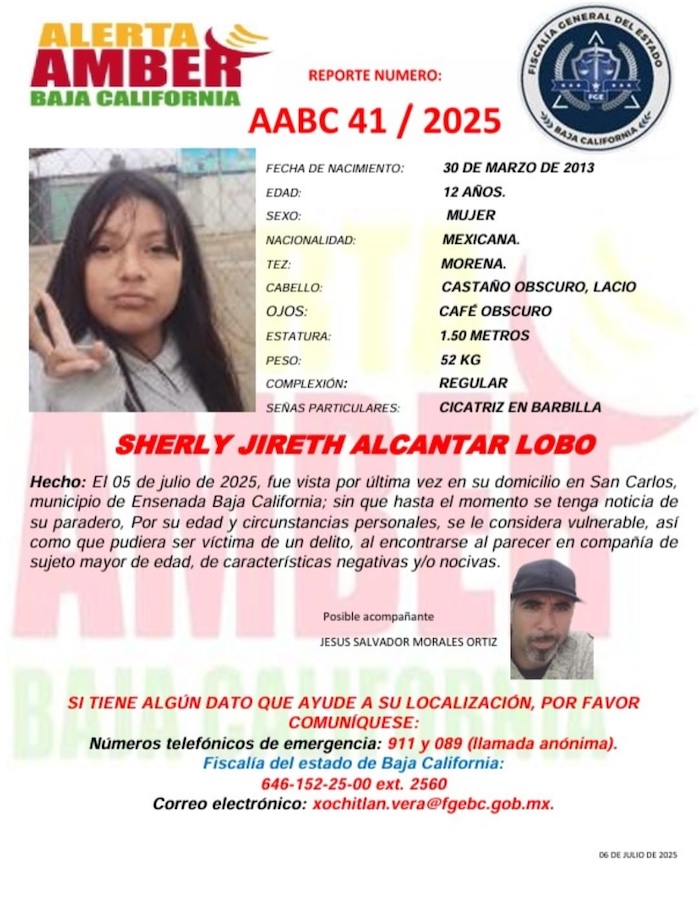 La Fiscalía General de Baja California ha activado la Alerta Amber para localizar a la menor Sherly Jireth Alcantar Lobo, de 12 años.