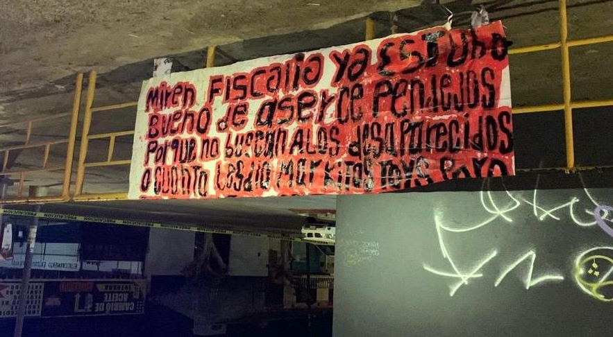 La manta fue colocada al revés con un mensaje alusivo a que las autoridades de investigación supuestamente no han buscado a los desaparecidos pero sí han detenido a presuntos homicidas del k fluencia Gael Castro Cardenas conocido como Gail Toys.
