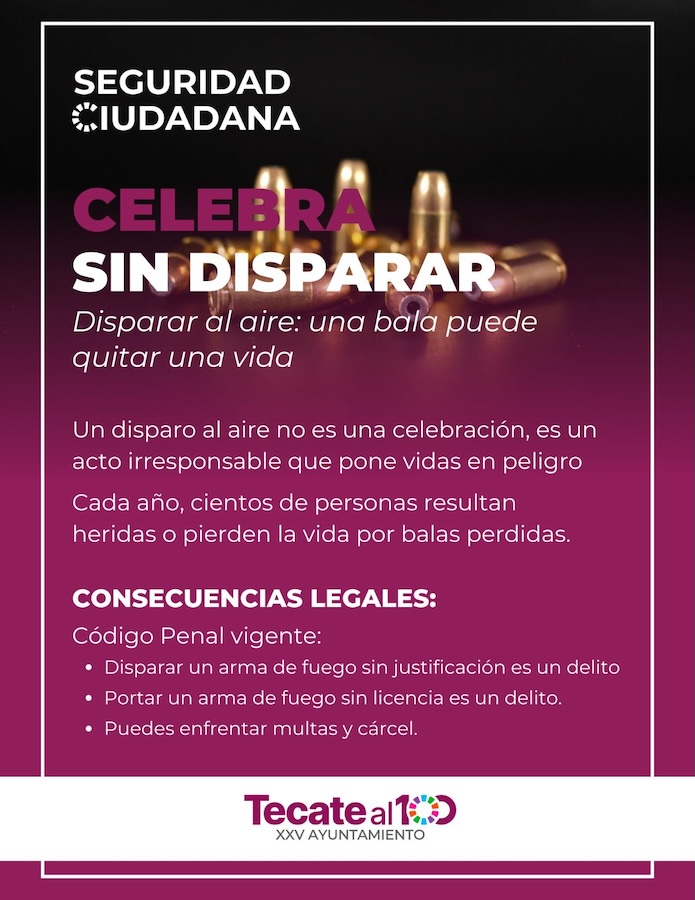 Debido al elevado riesgo de causar lesiones a quienes se encuentren en la vía pública, el gobierno municipal de Tecate solicita a la ciudadanía que se abstenga de realizar detonaciones con armas de fuego a manera de festejo durante Navidad y Año Nuevo.