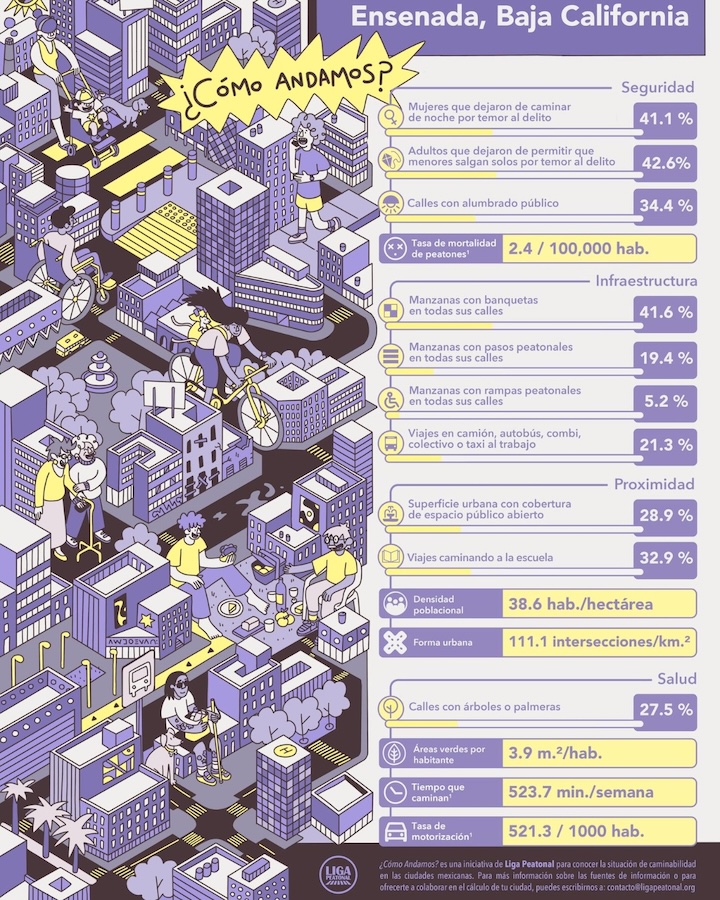 Debido a la inseguridad, en el municipio de Ensenada un sector de la población femenina dejó de salir a caminar durante la noche por temor a un delito, además que por el mismo motivo hay más adultos que no permiten salir solos a sus hijos menores de edad, de acuerdo a datos del estudio “¿Cómo Andamos?”, promovido por la asociación civil Liga Peatonal.