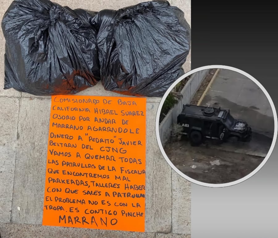 Varias bolsas negras que contenían con un narcomensaje dirigido al comisionado de la corporación en Baja California, Hibael Suarez Osorio, fue localizado en las instalaciones de la Fiscalía General del Estado (FGE), en la delegación Playas de Tijuana.