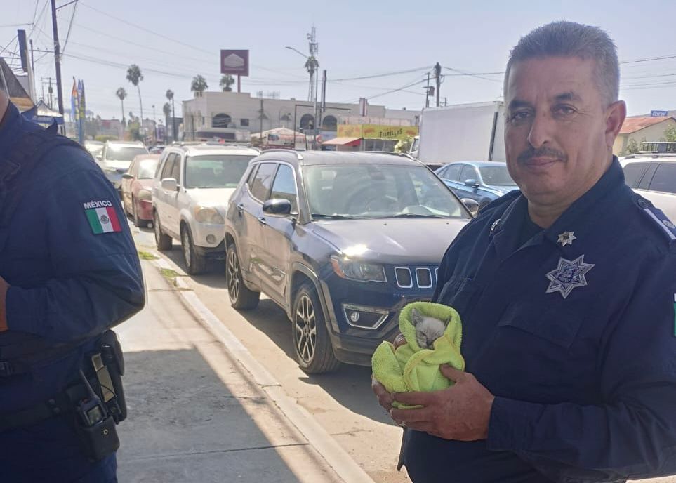 Un pequeño maullido movilizó a policías y bomberos en pleno centro de Ensenada.  - Foto: Cortesía.